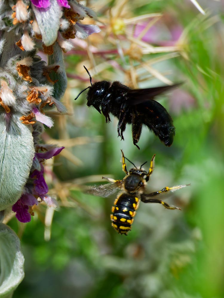 Das Ganze macht natürlich nur Sinn, wenn auch das Objektiv zur Kamera paßt. Quasi parallel zur Kamera kam deshalb das neue Tele-Zoom XF 150-600mm f/5,6-8 R LM OIS WR in den Handel, das mit Innenzoom, Innenfokussierung und starken Linear-Servomotoren nichts ausläßt, was gut und schnell ist. Dabei ist es mit 1600g um 515g leichter als das vergleichbare Sony FE 200–600mm. Zusammen mit der X-H2s bildet es eine Kombination, die eine ganz »neue« Art der Highspeed-Fotografie erlaubt. Bei f600mm wird ein ABM von 0,24 erreicht, sozusagen Makro aus 2,4m Entfernung. Mit 40B/s, pre-capture und AF-C gelingen dabei sogar Fotos wie der nebenstehende Angriff einer Wollbiene ♂ auf eine Holzbiene. Mit der klassischen Lichtschranken-Methode wäre es viel schwieriger gewesen, wenn überhaupt möglich. Wenn es nicht gerade auf einen ABM von 1 ankommt, ersetzt das Tele-Zoom ein Makroobjektiv.